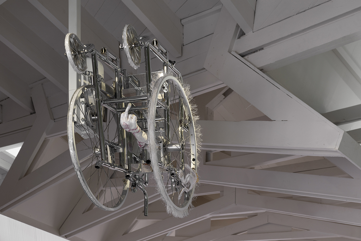 A wheelchair decorated with sequins and fringes, doing somersaults on the ceiling, refuses to listen the hate speech of ableist social and healthcare workers and just does what it wants. Ableism is most dangerous to non-disabled people and those in power, because it doesn’t teach them to trust that life is good and dreams can be fulfilled even when one’s way of functioning changes.